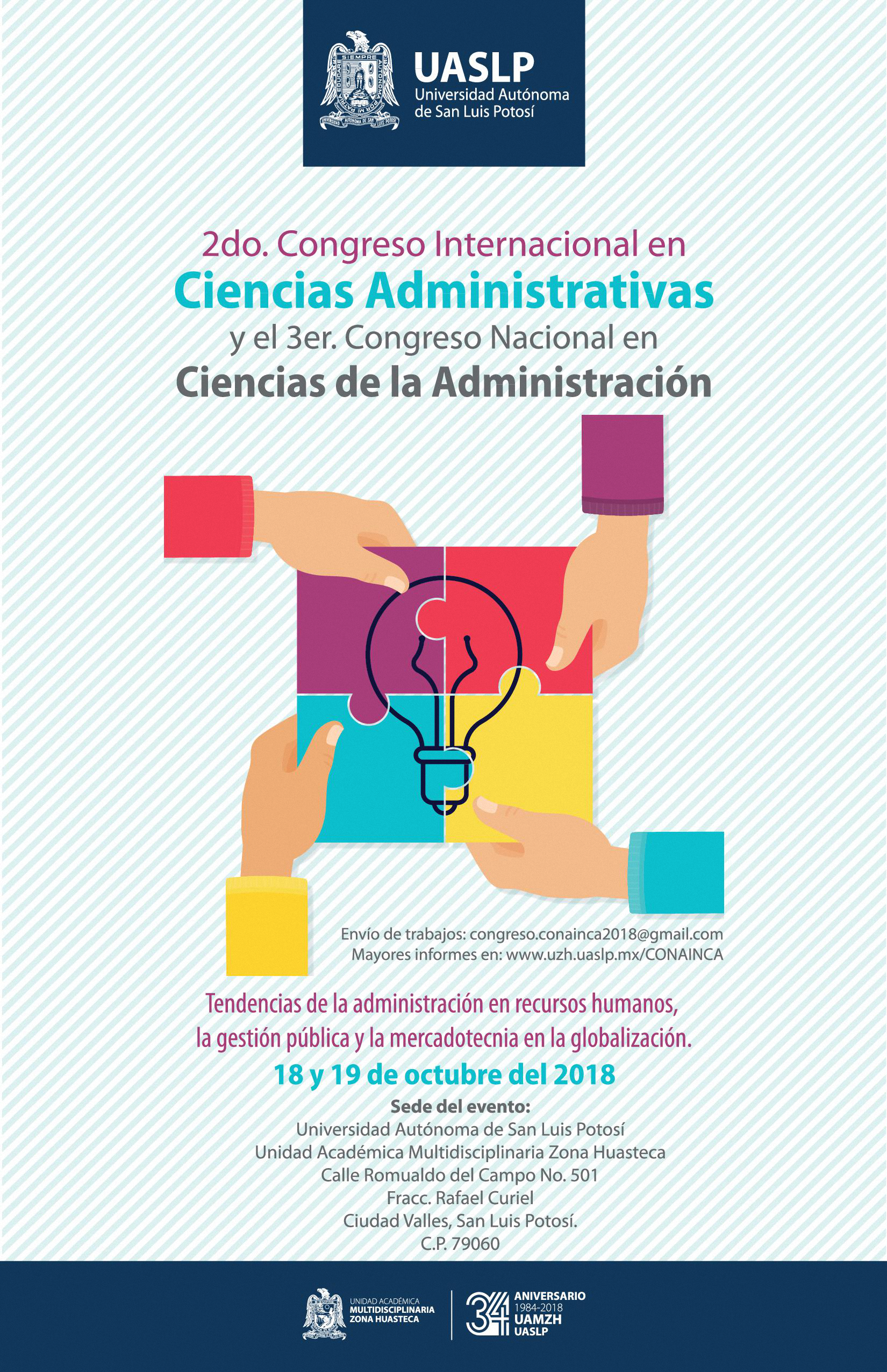 La Universidad Autónoma de San Luis Potosí, a través del Programa Educativo de Administración, el Cuerpo Académico Biotecnología, Medio Ambiente y Sustentabilidad, y la Red de Investigadores en Ciencias de la Administración, se complacen en invitarlos a participar en el 3er. Congreso Nacional de Ciencias de la Administración y 2do. Congreso Internacional en Ciencias Administrativas (CONAINCA 2018), el cual se llevará a cabo del 18 al 19 de octubre del 2018 en la Unidad Académica Multidisciplinaria Zona Huasteca de esta Universidad. El evento, será un espacio donde los participantes podrán presentar y discutir los resultados de sus investigaciones, intercambiar experiencias con sus pares académicos, generar nuevas colaboraciones o bien, tener el gusto de coincidir con amigos y colegas. En el caso de estudiantes, será una oportunidad para contactar investigadores, adquirir conocimientos de vanguardia en las Ciencias de la Administración, que complementen su formación académica, y favorezcan una formación integral y multidisciplinaria.